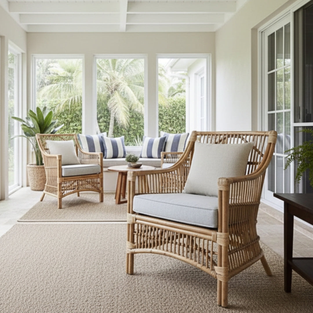 Introducing the inviting, airy and relaxing Reus Armchair. You’ll feel like everyday is a holiday with this resort style armchair. Made from solid cane and all weather fabric the natural strength will last for years suitable for patio undercover.