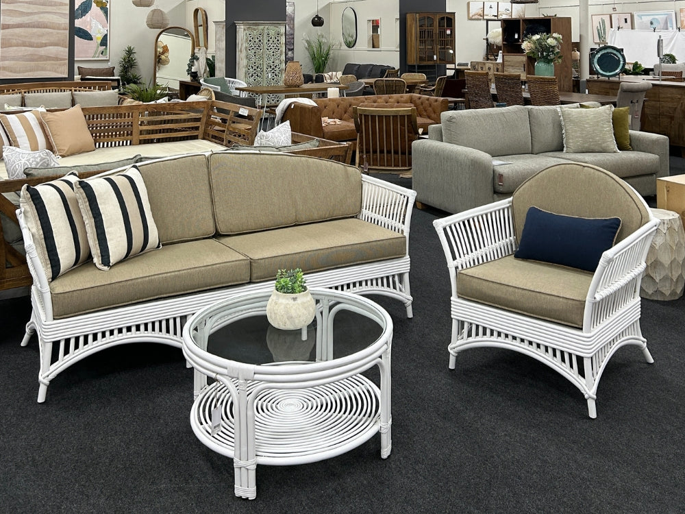 This natural cane range is available in single armchair, two seat, three seat coffee table & side table in both natural and white.